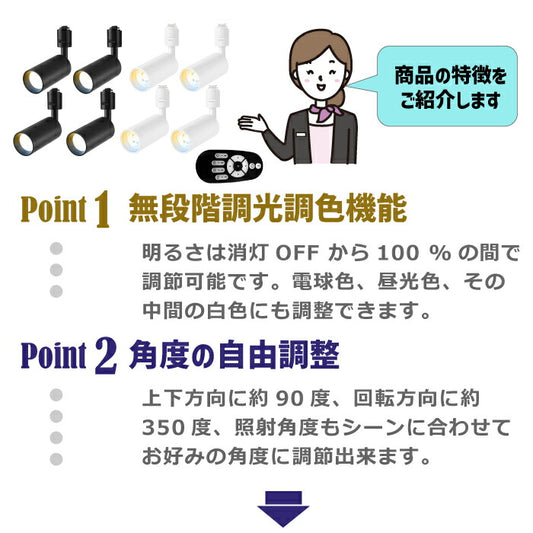 【4個セット】LEDスポットライト|ダクトレール用 リモコン付 調光・調色可能 大光量省エネ