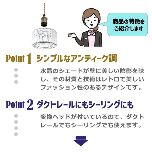 北欧風の水晶シェードが魅力のペンダントライト。引掛・ダクトレール式対応で設置簡単。おしゃれ空間に最適!