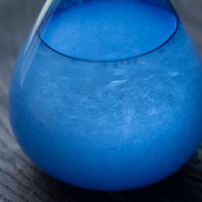 ●ストームグラスは19世紀に航海士等が使用していた天候予測器です。樟脳(クスノキのエキス)やエタノール等をガラス管に密封して作られており、気候の変化に反応して起きる結晶を観察する事で、役立てられていました。