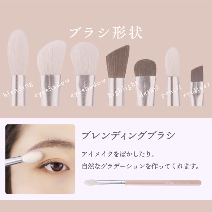 ・ アイシャドウブラシ、ブレンディングブラシ、ハイライトブラシなど、用途に合わせた7本セット