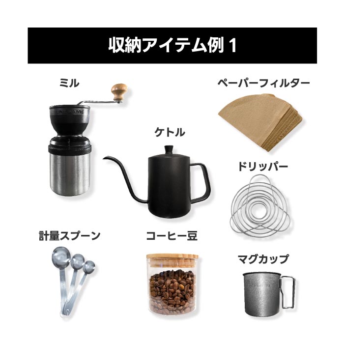 例1:コーヒーツール(ミル、ドリッパー、コーヒー豆、フィルター、計量スプーン)