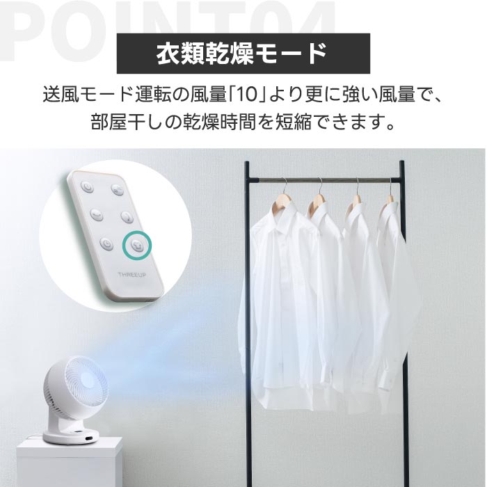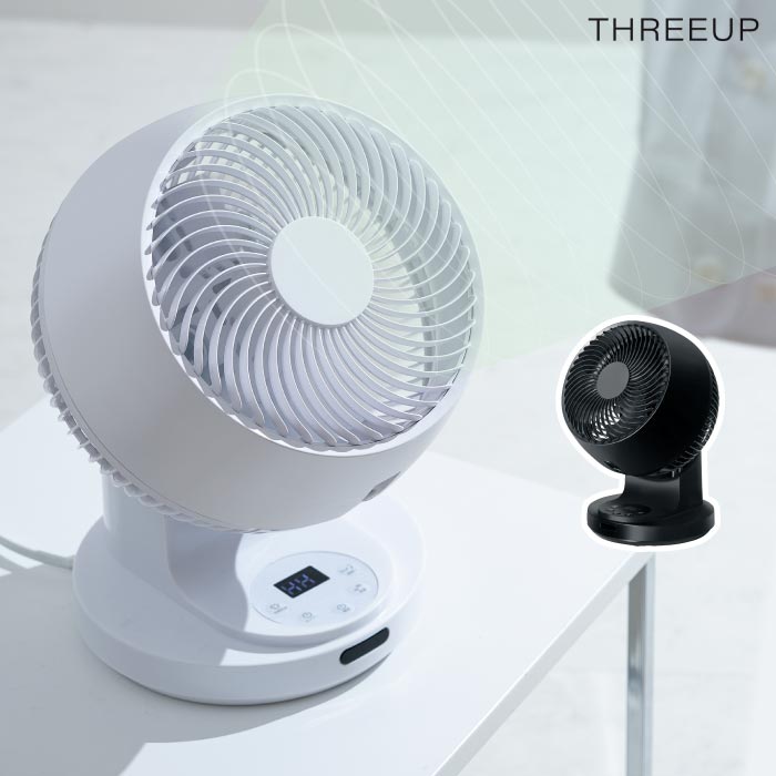 快適な室内環境を実現するThree-upのDCターボサーキュレーターは、高性能DCモーターを搭載し、静かな運転音から強力な風まで11段階の風量調整が可能です。首振り機能付きで、上下左右に自動で回転し、お部屋の隅々までしっかりと空気を循環させます。特に便利な衣類乾燥モードは、湿気の多い日でも洗濯物を素早く乾燥させることができます。操作パネルは液晶表示で直感的に使用でき、リモコンでの遠隔操作も可能。お手入れはガードを工具不要で簡単に外せる設計なので、いつでも清潔に保つことができます。コンパクトながらも、そのパワフルな送風能力で、夏場の暑さ対策はもちろん、オールシーズン快適な室内空間を提供します。家庭用はもちろん、オフィスや寝室、書斎にも最適です。白色でシンプルなデザインはどんなインテリアにも馴染み、おしゃれな空間を演出します。
