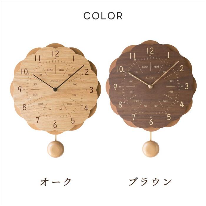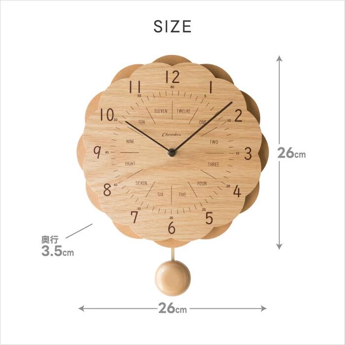 注意事項 | ※ご覧の環境により、色の見え方が異なる場合がございます。 ※仕様、デザインは商品改良のため予告なく変更する場合がございます。 ※当製品は振り子が露出しているデザインのため、設置の際に時計が傾き、振り子が壁に当たってしまうと、振り子がうまく稼働しない状態になってしまう場合がございます。時計と壁が出来るだけ平行になるように設置してください。(同梱しておりますネジを使用し、壁と平行に設置いただけますと、振り子と壁の接触なくご使用いただけます。) |