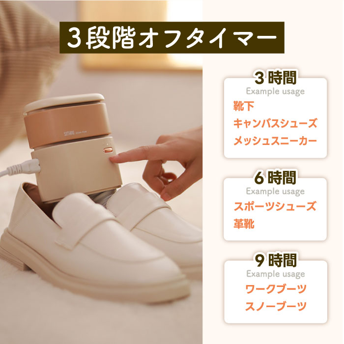 あたためすぎを防ぐオフタイマー(3時間、6時間、9時間)が設定できます。靴のタイプや湿気の程度により時間を設定できます。