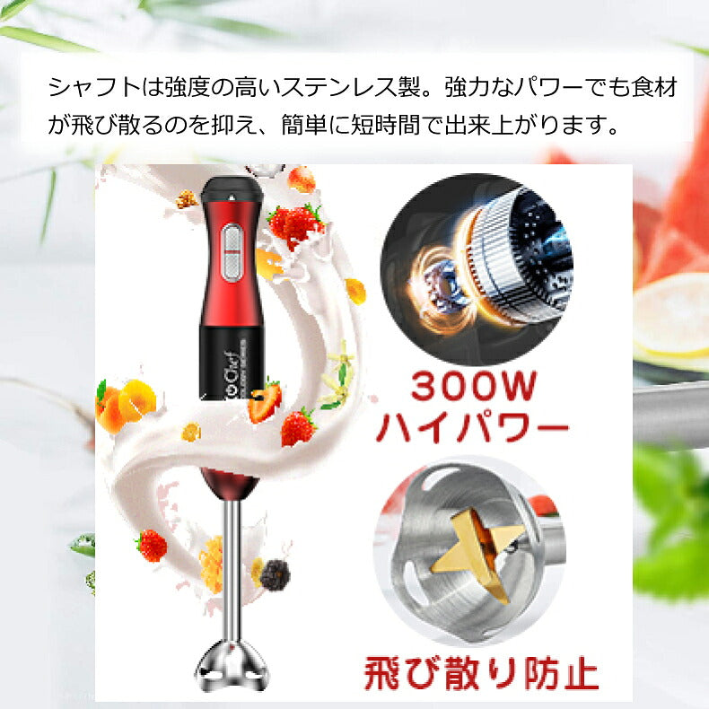 | パッケージ内容 | 本体(モーター部分)×1、ブレンダー×1、泡立て器×1、チョッパー(500ml)×1、切軸x2、蓋付きカップ(800ml)×1、収納スタンド×1、取扱説明書×1、24時間フレンドリーなカスタマーサービス。 |