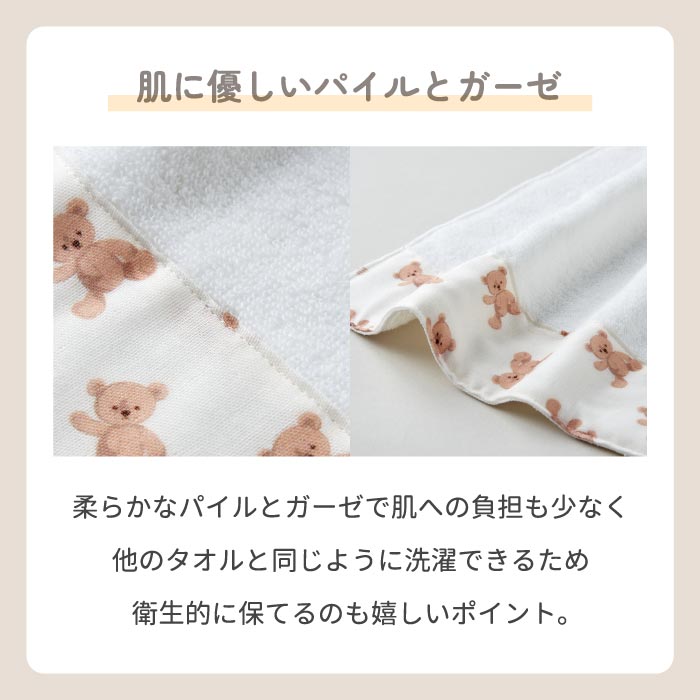 A4. 肌にやさしいパイルとガーゼを使用しています。柔らかく吸水性に優れており、デリケートなお子さまの肌にも安心です。