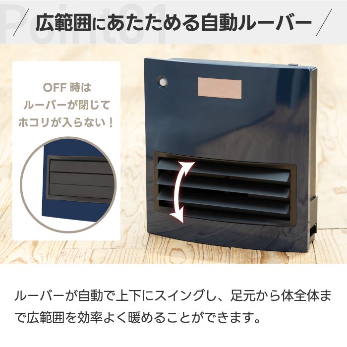 ・ 上下スイング機能付きルーバーで足元から全身までムラなく暖房。電源オフ時は自動で閉じてホコリの侵入も防止。