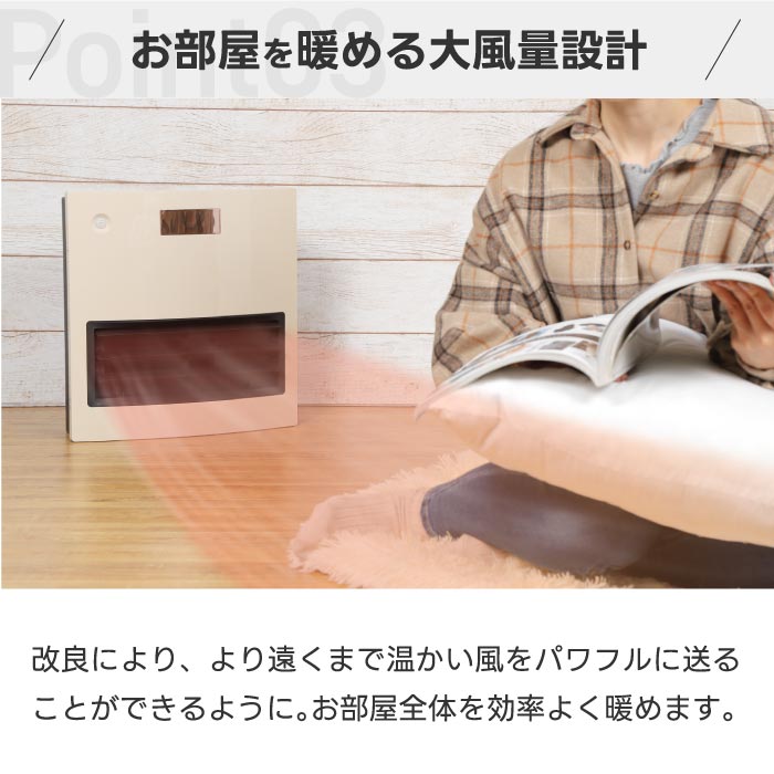 A. スイッチを入れて数秒で温風が出る速暖タイプです。モーター改良による大風量設計で、通常のセラミックヒーターよりも約1.5倍の風量を実現。お部屋全体をムラなく暖めます。