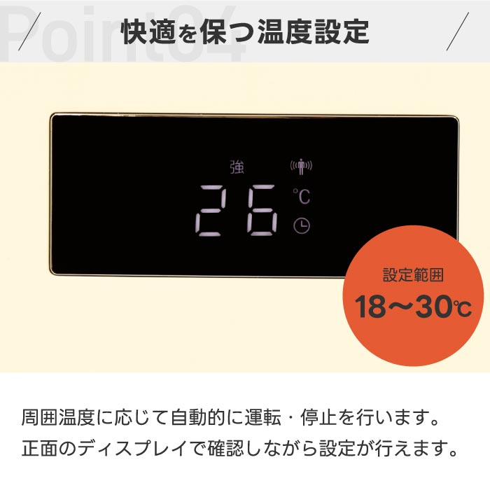・ 設定した温度に合わせて自動調整。暖めすぎや電力のムダを防ぎます。