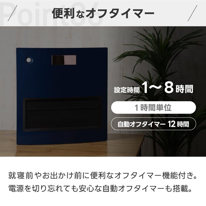 ・ オフタイマー(最大7時間)搭載、リモコン付きで操作も簡単。電源オフ時もルーバーが自動で閉じる安心設計。