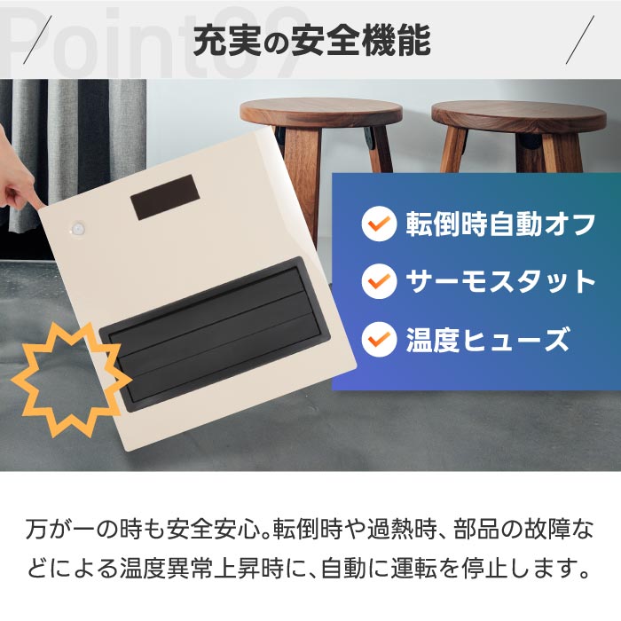 ・ 転倒時自動オフスイッチ、サーモスタット、温度ヒューズを搭載。小さなお子様やペットがいる家庭でも安心。