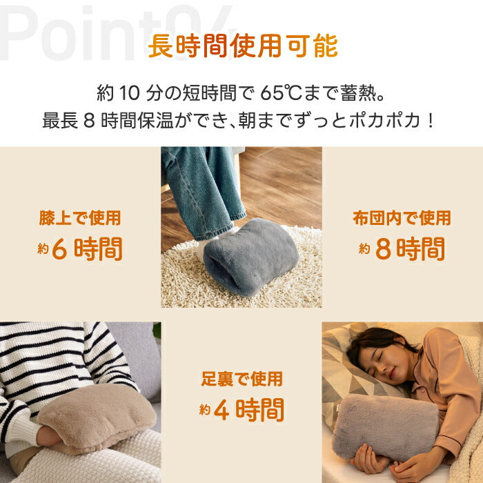 | 保温時間(目安) | 膝上使用の場合:約6時間前後 足裏使用の場合:約4時間前後 ふとん内で使用の場合:約8時間前後 |