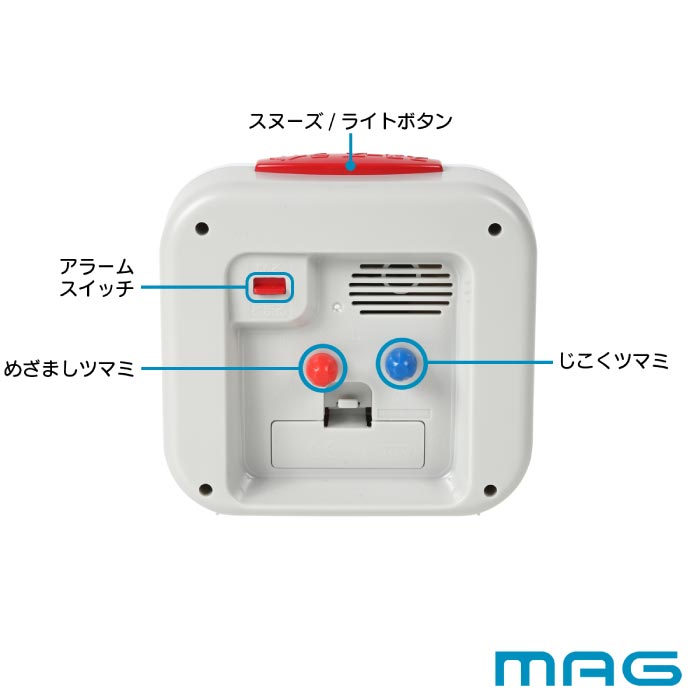 【重要】安全上のお知らせ | 時計のツマミは強く引っ張ると外れることがあります。ご使用の際はツマミを引っ張らないようにして下さい。 万が一ツマミが外れた場合、小さな部品は誤飲や窒息の危険があります。3歳未満のお子さまには絶対に与えないでください。 |