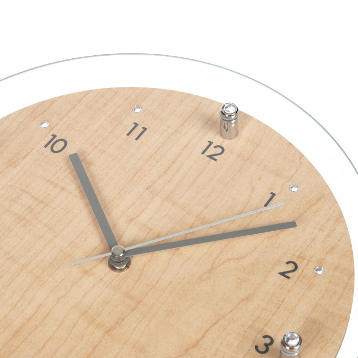 ・ 文字盤には温かみのあるMDF素材を使用。木の質感がインテリアに自然に溶け込み、ガラス板を重ねることで奥行き感を演出した洗練されたデザインです。